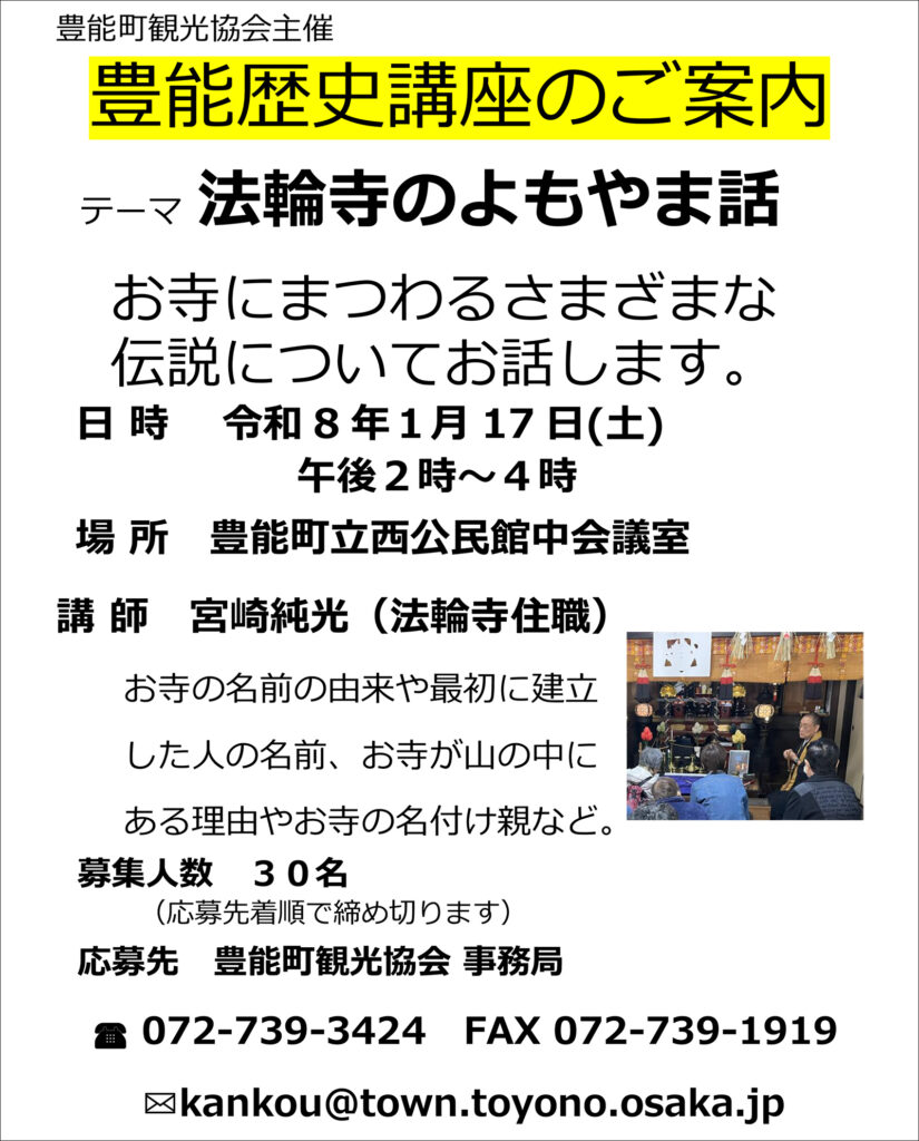 今年初の豊能歴史講座は、豊能町川尻の古刹「法輪寺」にまつわるさまざまな伝説について住職にお話を伺います。