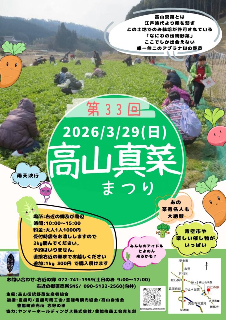 3月29日(日)、高山右近の生誕地である高山で、高山伝統野菜生産者組合さんによる「第33回高山真菜まつり」が開催されます。