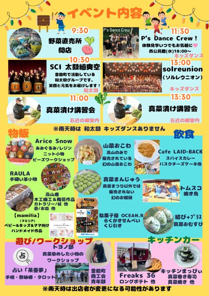 収穫体験や真菜を美味しくいただける「漬物講習会」のほか、野菜直売所や美味しいグルメ販売、キッチンカー、手作り工芸品や占い、ワークショップなどお楽しみが盛りだくさん。