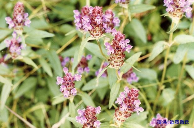 「靭草」と書き、花穂を矢を入れて背おう武具のうつぼに見たてた名です。又一名をカコソウ「夏枯草」ともいい、今年咲いた花が咲き終わるとずぐ枯れてしまうのでいいます。この枯れたものが利尿薬となります。(上田) |