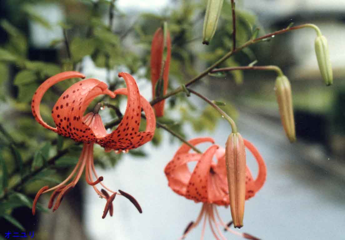 オニユリは庭や畑によく植えられているが自生はそれほど多くはありません。7〜8月頃陽地で花を見かけます。