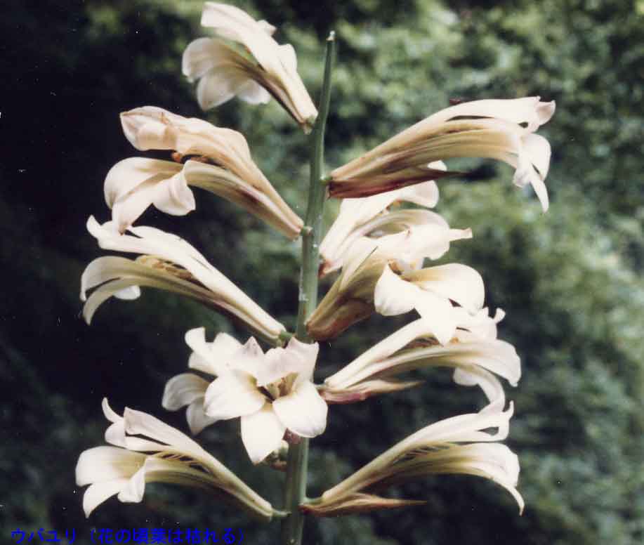 葉は広く網脈がありユリのイメージとかなり異なります。やや湿った藪や林の中に生えており、夏の終り頃長い茎を出し茎から横向きに大きな花を数個つけます。